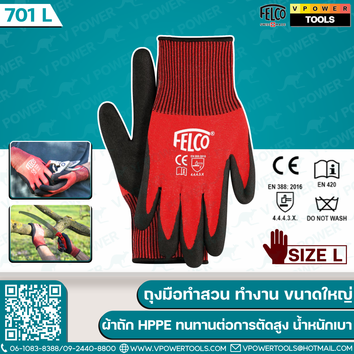 FELCO 701L ถุงมือทำสวนขนาดใหญ่ ผ้าถัก HPPE ทนทานต่อการตัดสูง ไซส์ L