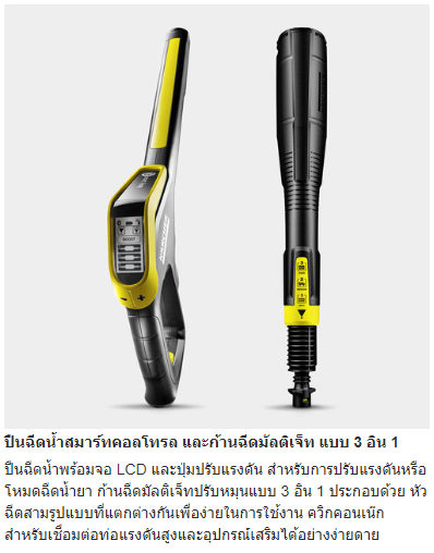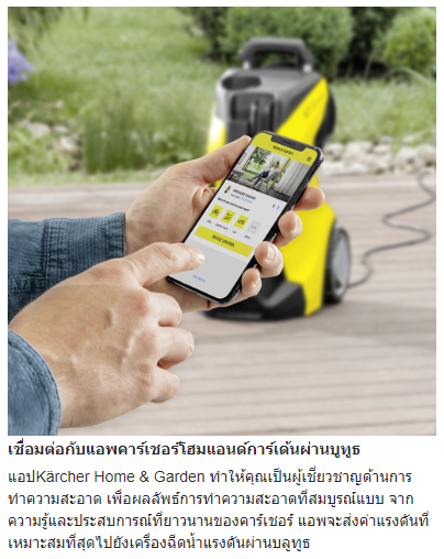 เครื่องฉีดน้ำแรงดันสูง รุ่น K 5 Premium Smart Control: สามารถเชื่อมต่อด้วย Bluetooth ในตัวผ่านแอพพลิเคชั่น Kärcher Home & Garden ผ่านสมาร์ทโฟน สามารถสั่งการหัวปืนฉีด G 180 Q Smart Control เพื่อปรับเพิ่มระดับแรงดัน 3-in-1 ให้เหมาะสมกับหน้างาน สามารถดูสถานะแรงดันบนจอ LCD ระดับแรงดันจะคงที่การตั้งค่าล่าสุด จะไม่สามารถปรับหรือเพิ่มแรงดันได้ในกรณีหยุดใช้งานเครื่อง พร้อมระบบน้ำยาทำความสะอาด Plug ’n’ Clean และโรลม้วนเก็บสาย รวมไปถึงที่อุปกรณ์เสริมที่ง่ายในการหยิบใช้งาน เหมาะเป็นอย่างยิ่งสำหรับการทำความสะอาดคราบฝังแน่นปานกลาง (รถยนต์ขนาดเล็ก รั้วบ้าน จักรยาน) ด้ามจับอลุมิเนียมปรับขึ้น-ลงสำหรับการเคลื่อนย้าย/จัดเก็บ Induction Motor ผลิตที่ประเทศอิตาลี่ มีช่องเสียบคว่ำขวดน้ำยาทำความสะอาด (ไม่ต้องใช้สายดูด)