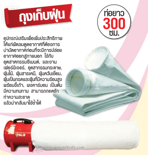 Polo ถุงเก็บฝุ่นสำหรับพัดลมระบายอากาศ 8", 10", 12", 16", 20", 24" อุปกรณ์เสริมเพื่อเพิ่มประสิทธิภาพให้แก่พัดลมดูดอากาศ ที่ต้องการบำบัดอากาศก่อนปล่อยออกสู่ภายนอก ใช้กับอุตสาหกรรมซีเมนต์ และงานเฟอร์นิเจอร์ อุตสาหกรรมกระดาษ ฝุ่นไม้ ฝุ่นสารเคมี ฝุ่นควันเชื่อม ฝุ่นที่เป็นกรด และฝุ่นที่มีความร้อนสูงพร้อมขี้เถ้า ผงคาร์บอน เป็นต้น มีความทนทาน สามารถถอดซักทำความสะอาด แล้วนำกลับมาใช้ซ้ำได้ ![]()